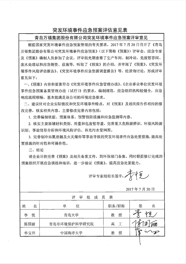 青岛俄罗斯专享会集团肉类食品公司 突发环境事件应急预案评估意见表公示